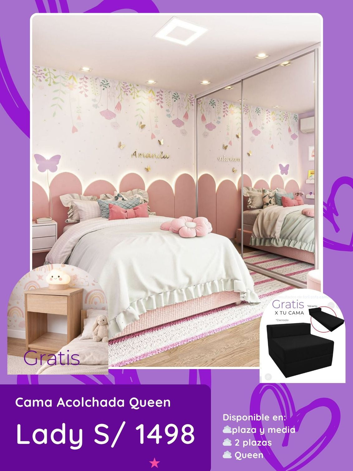 *Gratis por tu compra un velador o un sofá cama plegable. (escoger)