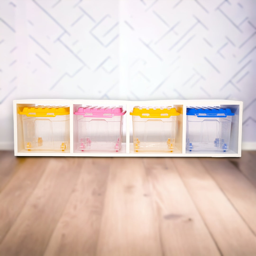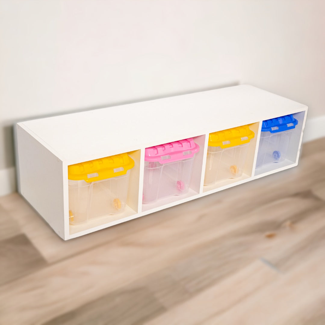 Un rincón de descubrimiento y aprendizaje que refleja la estética ordenada y real que promueve este enfoque educativo. Cuatro compartimentos espaciosos diseñados con precisión para la clasificación eficiente de juguetes, siguiendo la filosofía Montessori de un ambiente preparado.