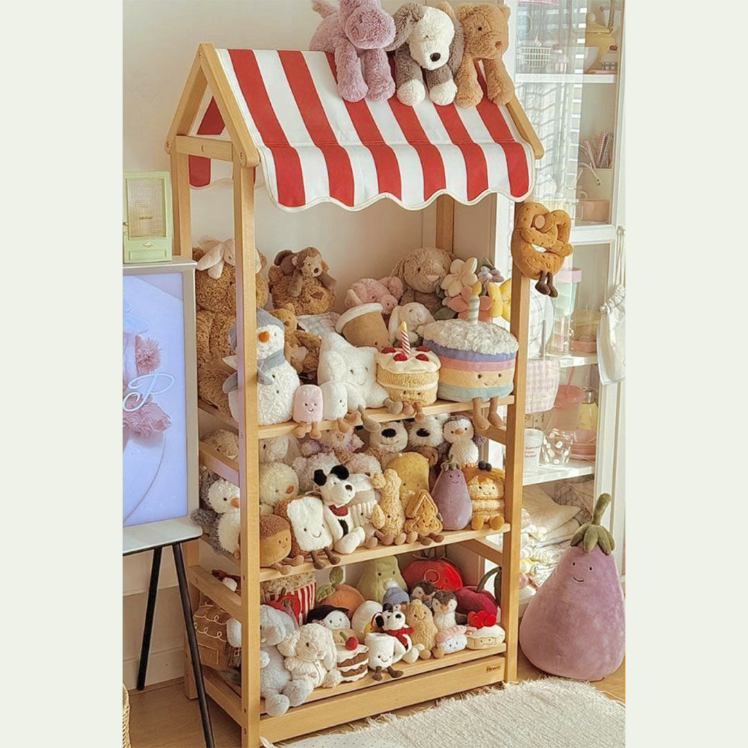 Perfecto para almacenar peluches, libros, juguetes o incluso montar pequeñas actividades de juego simbólico, gracias a su diseño inspirado en los mercados infantiles.