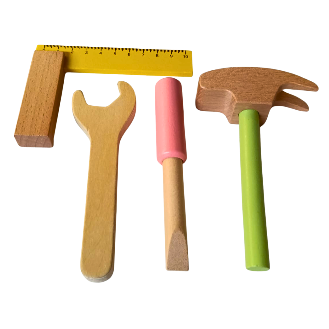 Set de herramientas de madera didáctico incluye martillo, llave, reglas, pernos, tuercas y más.